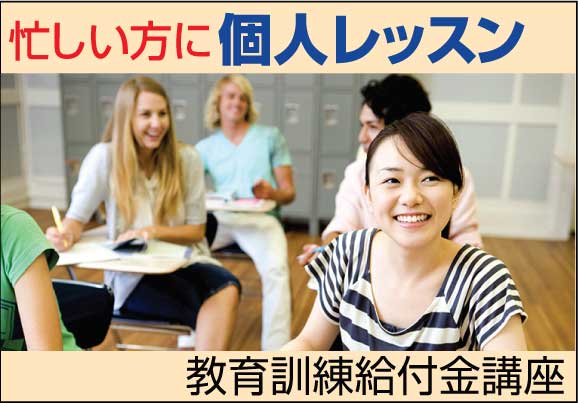 など、様々なご希望に応えることが可能になります。 授業内容やカリキュラムの規定により、それを生徒さんに合わせて指導します。弱点克服や資格対策の効率的なレッスンを受けることが可能です。 教育訓練制度を利用する場合は、この制度システムによるシラバスを使いますが、自由度が高く、学習効果が高いのがこのコースの特徴です。